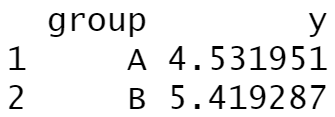 aggregate(y ~ group, data, mean) # Descriptive statistics by group