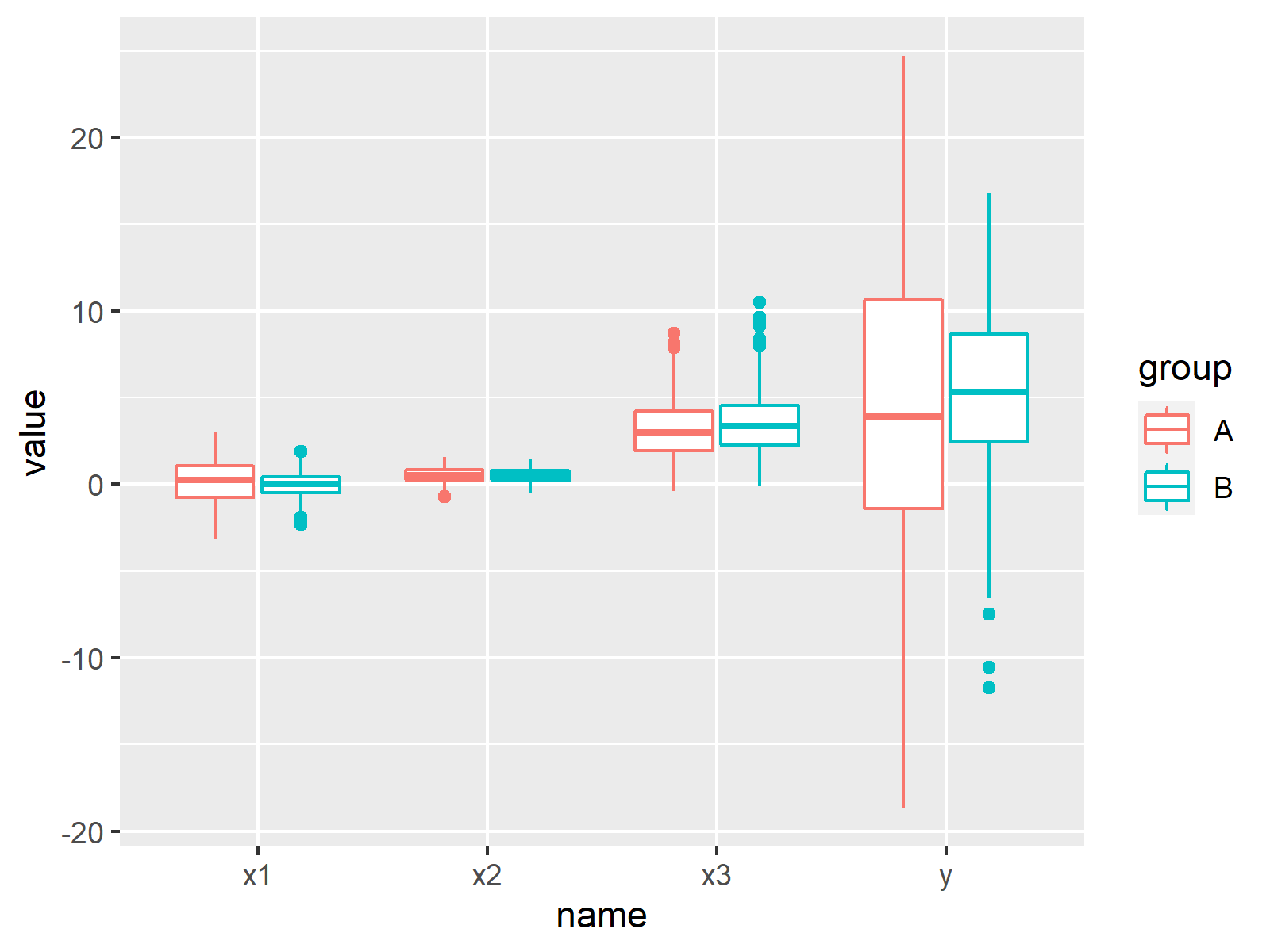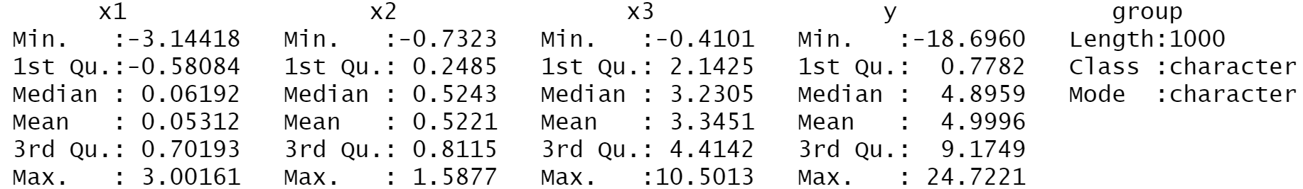 data <- data.frame(x1, x2, x3, y, group) # Store all variables in data frame