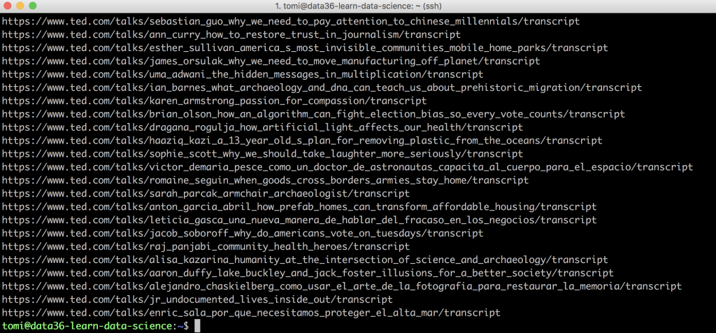 You can test this out in your Terminal… but in its final version let’s save the output of it into a file called ted_links.txt, too!