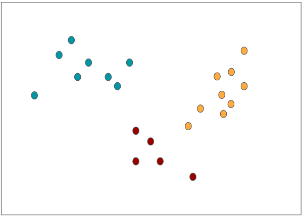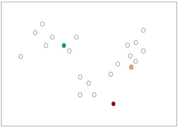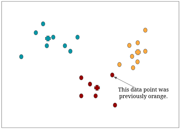 Now that we have three groups, each group’s cluster centroid gets recalculated (=will move to a new position) based on the average of the data points within the group, then the data points get assigned again to the closest cluster centroid (marked with a cross). Notice how data points can switch teams: