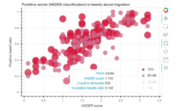 The bubbles’ size shows the frequency of words in the dataset. The low-frequency words were turned off in the picture. You can play with similar charts published on the links below.
